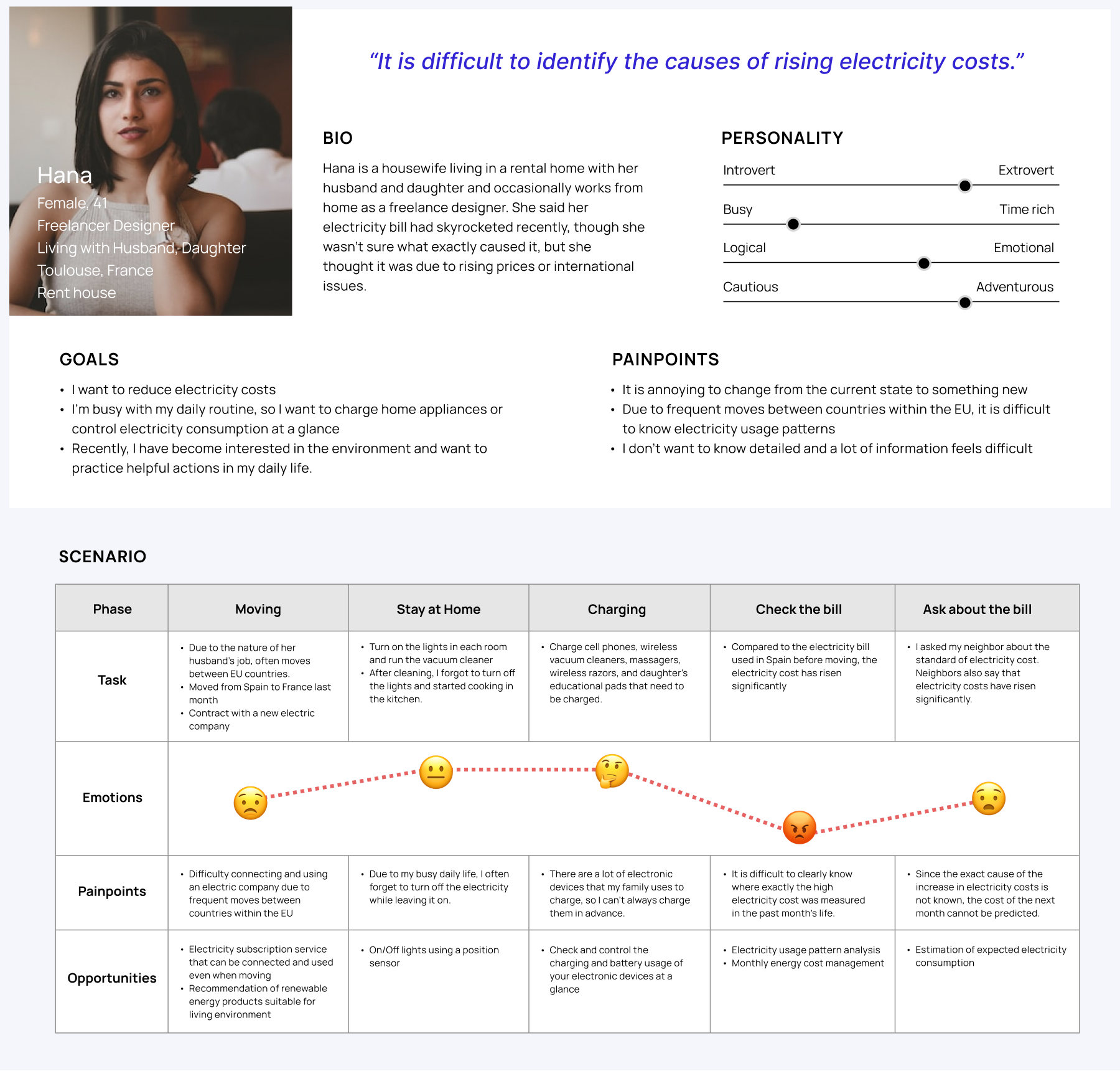 I conducted one-on-one interviews to understand their behavior and learn more about additional pain points. Each interview was completed and tried to understand how people use electricity in their homes and what discomfort they feel about energy use. I also conducted a survey about energy consumption patterns.