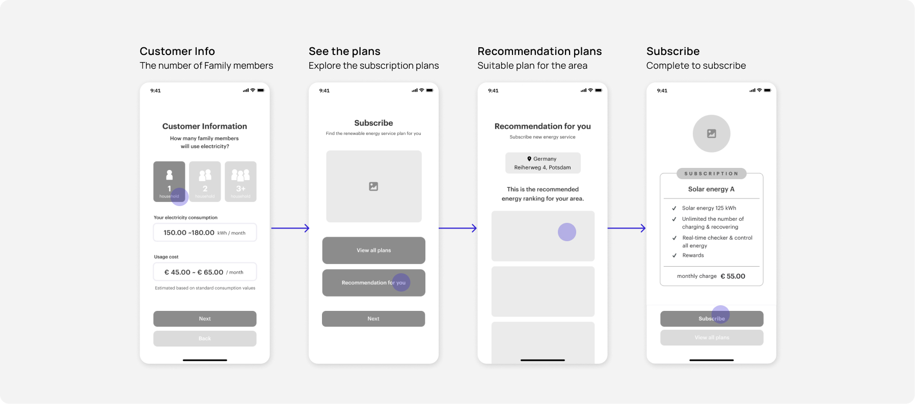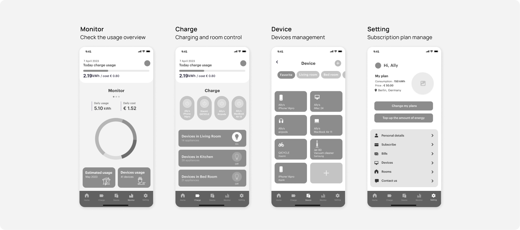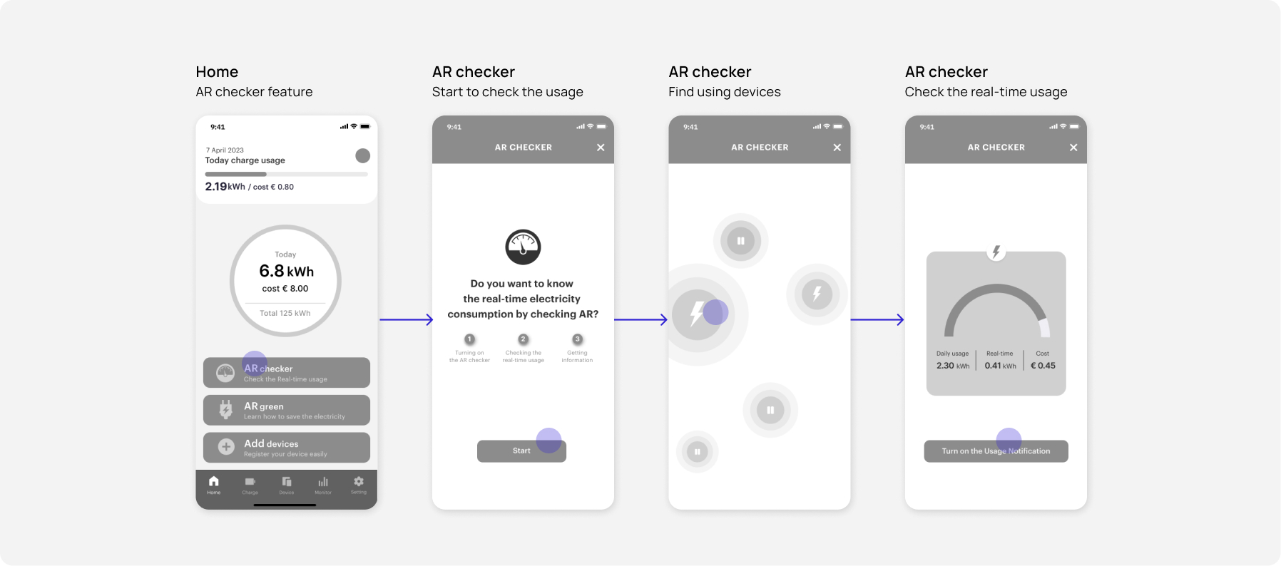 I started by creating mid-fidelity in Figma to create a user interface. I focused on the process of starting a subscription in onboarding and the main feature of checking real-time electricity consumption by AR.