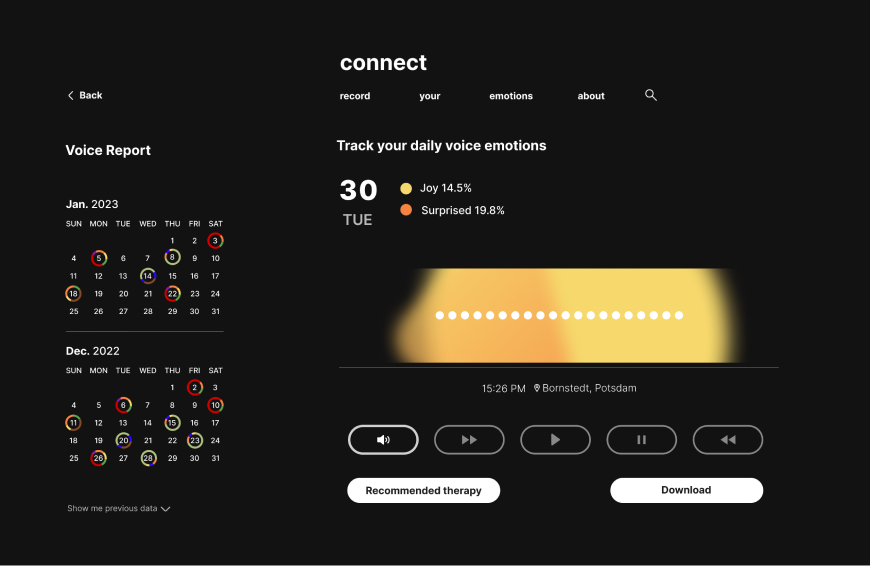 Data mirror as a concept help users can gain insight into their emotional state and potentially understand themselves better. Our platform acts as a mirror that reflects the different emotions of a person, similar to how a traditional mirror reflects their physical appearance. The goal of this data mirror is to promote emotional self-awareness and help users understand and manage their emotions more effectively.