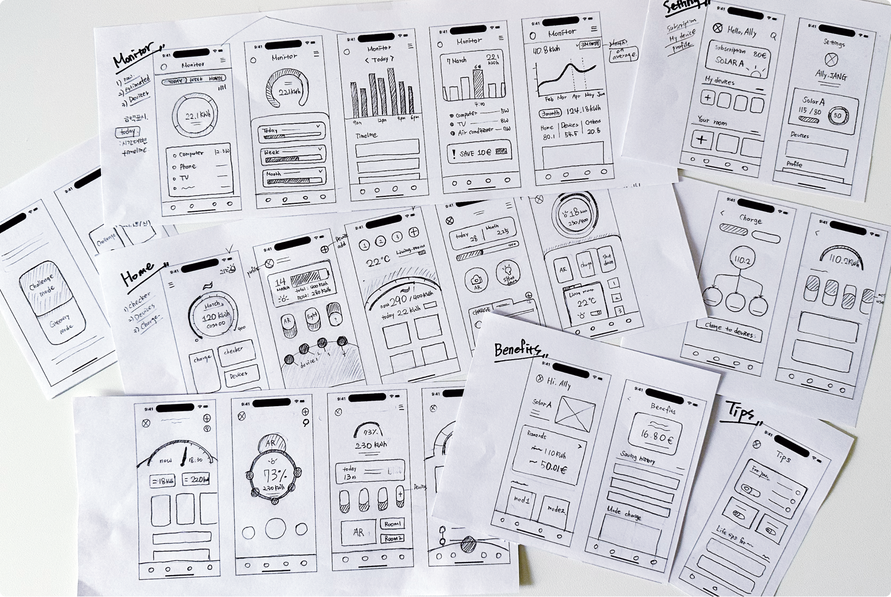 I sketched so users can simultaneously see the most used features on the landing page. I also wanted to show the boring numbers related to the monitor feature through various graphs.