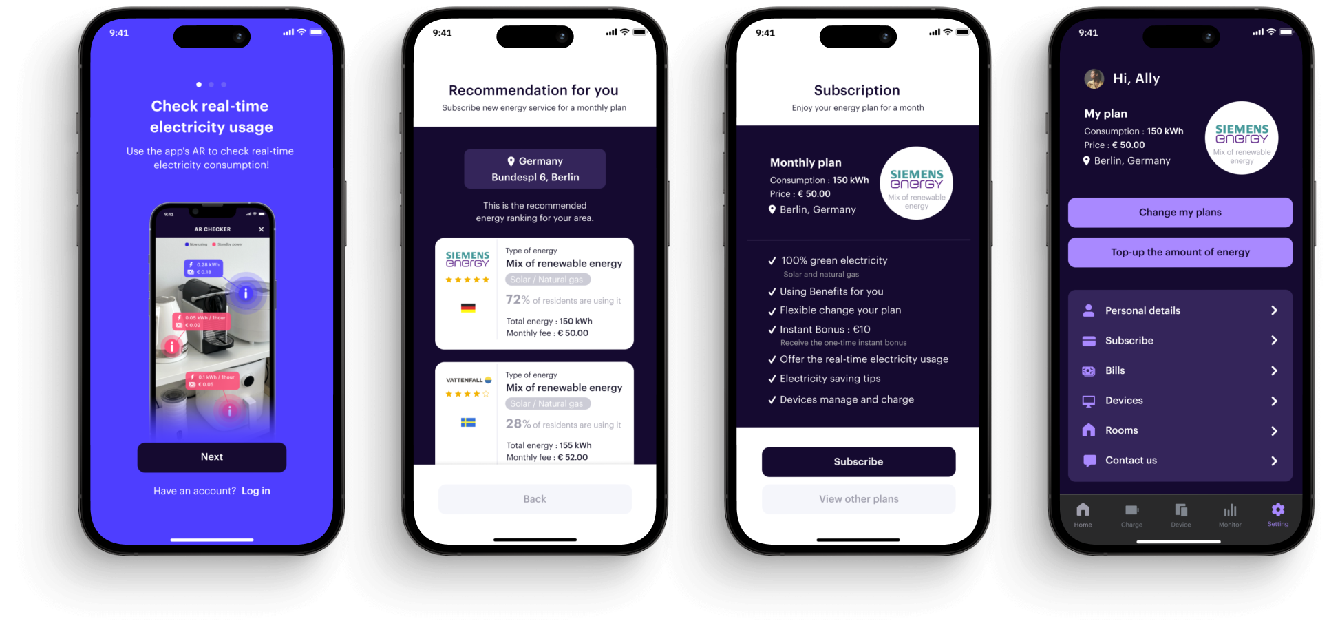 I started by creating mid-fidelity in Figma to create a user interface. I focused on the process of starting a subscription in onboarding and the main feature of checking real-time electricity consumption by AR.